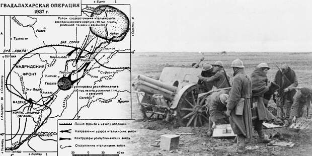Гвадалахарская операция, март 1937-го Бои затрудняли снег, ливни и туманы. Собравшись с силами, «красные» зажали вырвавшиеся вперёд итальянские войска в клещи и 18 марта перешли в контрнаступление. После танковой атаки боевые порядки итальянцев смешались, и Роатта приказал отходить. Под непрерывными ударами республиканских ВВС, которые бомбили застрявшие на горных дорогах колонны, отступление переходило в бегство. Итальянская авиация, базировавшаяся на грунтовых аэродромах, из-за дождей бездействовала. Погода, как всегда, была на стороне победителей. Разгром был полным. Итальянцы потеряли около восьми тысяч человек и значительную часть техники.